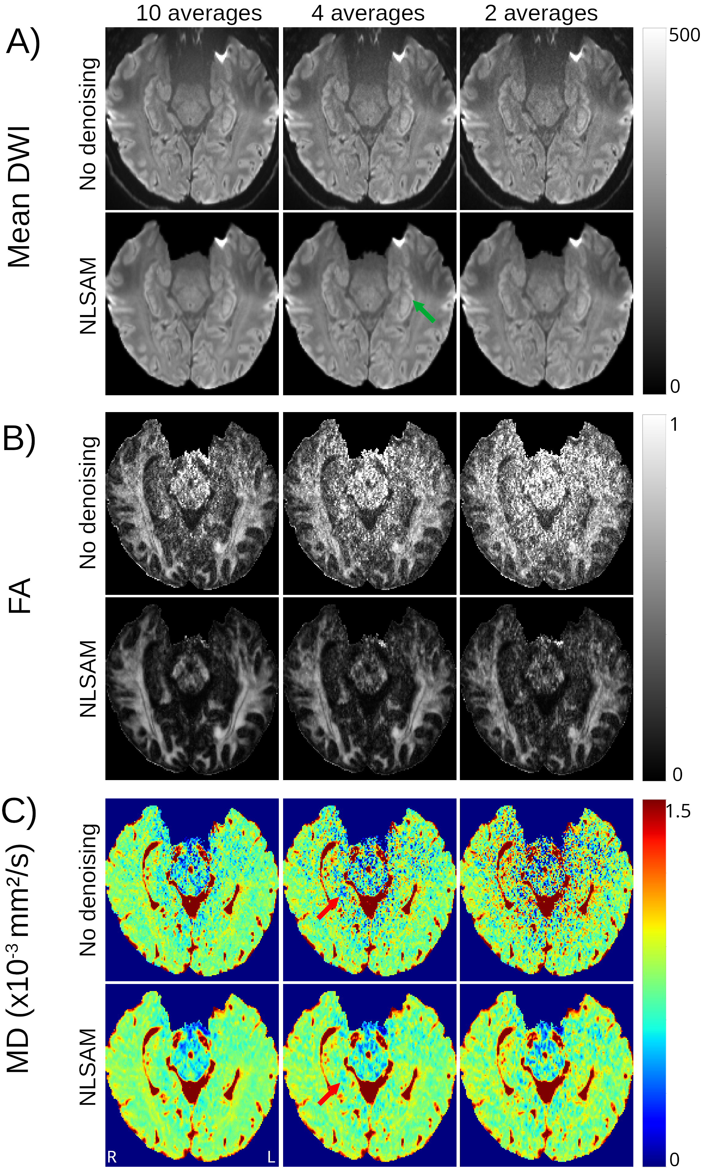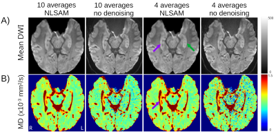 The denoised 4 average/10 direction 1 mm isotropic 2.2 min DTI was able to visualize loss of internal contrast (i.e. dark band of SLM) on mean DWI which corresponded to high MD in a TLE patient (Figure 3). Hippocampus MD maps of 3 TLE patients with 10 and 4 averages with denoising are almost identical, supporting a reduction in the number of averages for focal lesion detection (Figure 4).Discussion