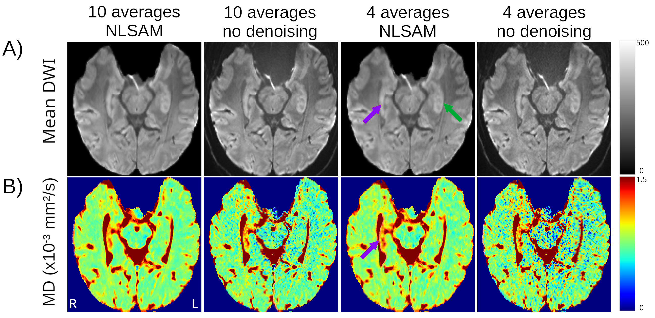 The purpose here was to use denoising in post-processing to reduce the number of averages and hence scan time needed to yield acceptable high-resolution 1 mm isotropic DWI and MD maps in healthy controls, and for the detection of focal lesions in TLE.Methods
