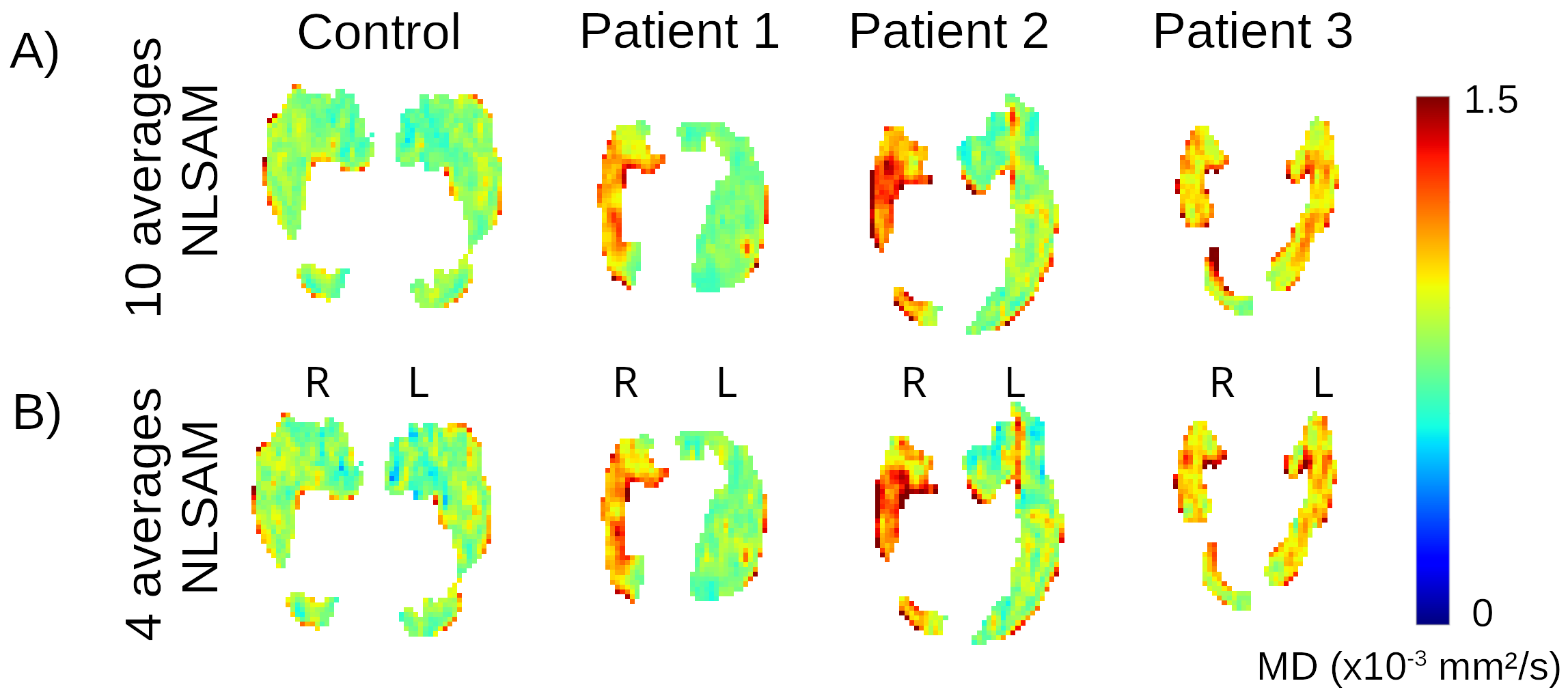 In the 18 controls, the number of averages of the denoised images was systematically reduced as subsets from 10 averages to 1 average, in steps of 1, using the same 10 directions. Image quality was assessed for delineation of internal features of the hippocampus (like the dark band of the Stratum Lacunosum Moleculare, SLM). A whole hippocampus region-of-interest (ROI) was obtained using a convolutional neural network12. for quantitative assessment including mean, standard deviation (STD), and mean square error (MSE, using as reference the 10 averages with denoising) of MD and fractional anisotropy (FA) across all controls (left and right combined). The visualization of focal regions of high MD were compared in the 14 TLE patients between the original 10 averages with denoising and the 4 averages subset with denoising (chosen as shown in Results).Results