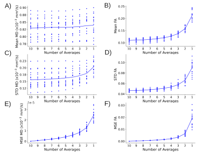 Hippocampal internal structure is clearly depicted in all of the mean DWI (b500) maps with and without denoising, even for as low as 2 averages, although denoising does cause some blurring (Figure 1A). The 10 averages without denoising yields abnormally low MD voxels within the hippocampus (blue voxels, MD <0.6x10-3 mm2/s) and excessively high FA values that get exacerbated with fewer averages; these biased low MD and high FA voxels are reduced with denoising, even with only 4 averages (Figure 1B, C). Mean MD for all controls is almost constant across averages, while mean FA is elevated when reducing the number of averages (Figure 2A, B). Based on the STD and MSE versus averages for the denoised images, 4 averages of 10 diffusion directions appears suitable to accelerate scan time to only 2.2 minutes (Figure 2C-F).