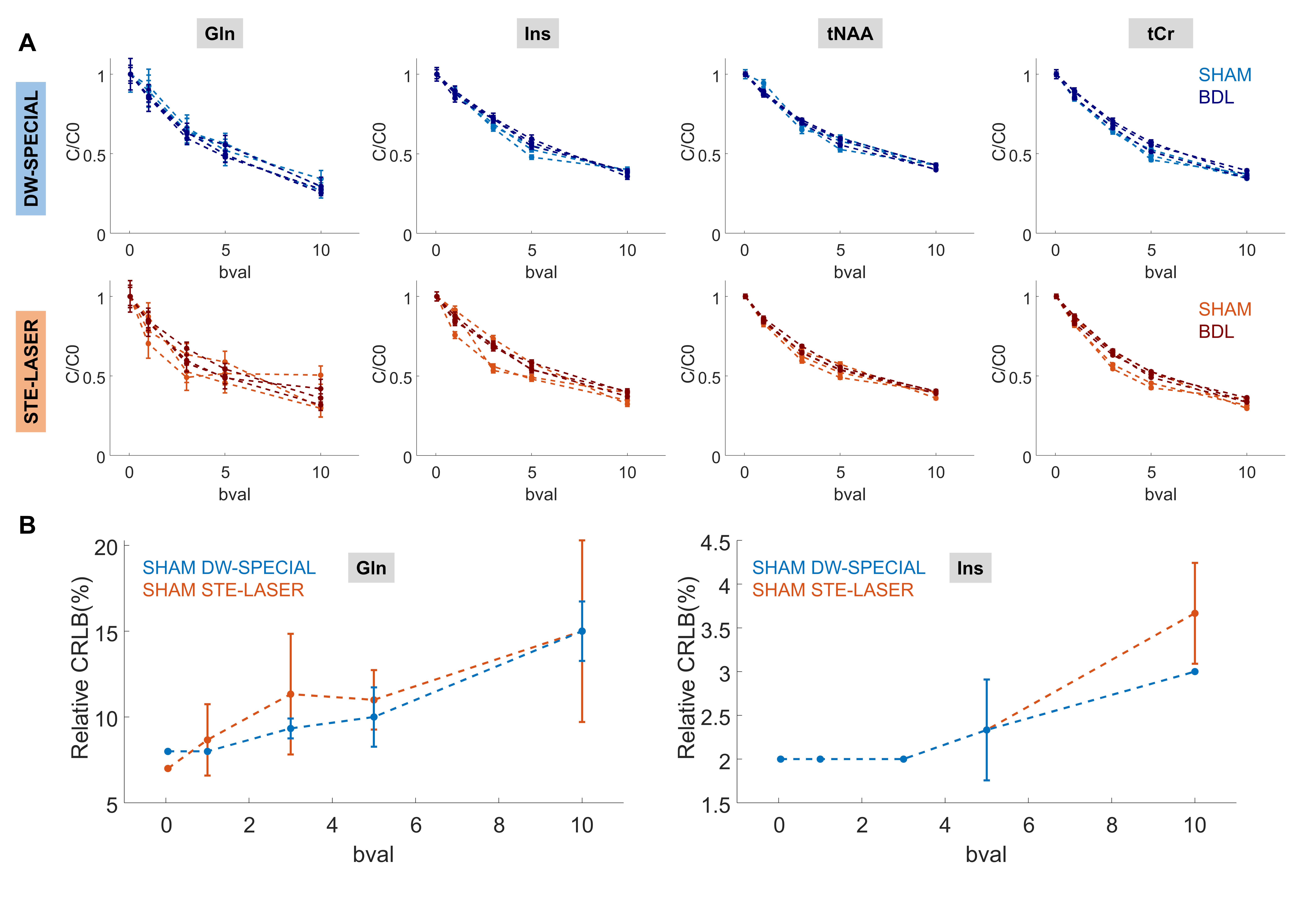 Fig 3. Validation of the DW-SPECIAL sequence. A, top: overlapped spectra at b=0.05 ms/µm2. The difference for singlets is linked to slightly different voxel selections and underlying MM, the effect of T2 relaxation being minimal between 18 ms and 33 ms. A, bottom: Gln fit extracted from LCModel quantification and predicted patterns from the basis-set simulations, confirming a greater loss by J-evolution in STE-LASER. B: Diffusion decay of total N-acetylaspartate (tNAA) in a phantom, where the closely-matching diffusion decays confirm the absence of cross-terms in DW-SPECIAL.