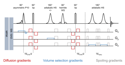 Fig 1. DW-SPECIAL sequence diagram. First 90° pulse: slice-selective asymmetric P10 (0.5 ms, 13.5 kHz, 18% refocusing factor), allowing to reduce the minimum TE. 2nd and 3rd 90° pulses: non slice-selective square (0.1 ms, 12.8 kHz). Bipolar diffusion gradients limit the effects of Eddy-Currents. The adiabatic inversion is performed on the y direction with strong B1 inhomogeneities. Water suppression: VAPOR17. No cross-terms between diffusion and imaging gradients contribute to the b-value. Spoiler gradients were adjusted empirically (arbitrary values displayed).