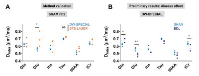 Fig 5. Estimated Dintra with Callaghan’s model. A: Dintra estimation from the two sequences for SHAM rats and for a few metabolites of interest. No overall significant difference was observed between the sequences, except for Glu. B: Group comparison with DW-SPECIAL of Dintra in this brain region and disease effect. Despite the small sample size, BDL rats tentatively show higher Dintra for Gln and lower for Glu and tCr compared to the control group. Statistics: animal-matched 2-way ANOVA with Bonferroni multiple comparisons test (*: p<0.05, **: p<0.01).