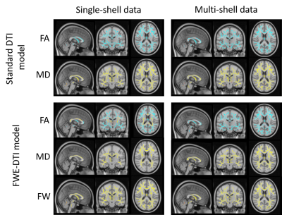The Free-water elimination (FWE) model for Diffusion Tensor Imaging (DTI) was first introduced by Pierpaoli1. Besides estimating the volume fraction of FW (FW index), this model can also estimate FW-compensated DTI parameters. Single-shell (SS) diffusion MRI acquisitions are more common in clinical cohorts due to time constraints. However, the FWE-DTI model is a two-compartment model, hence only well-posed for multi-shell (MS) data. To overcome this constraint, Pasternak2 proposed a spatially regularized gradient descent (RGD) algorithm to fit the FWE-DTI model to single-shell data, which is highly dependent on the initialisation method3. This regularised approach has been used to study healthy ageing4, Alzheimer’s5 and Parkinson’s6 disease, amongst others, largely ignoring the methodological concerns over RGD procedures.