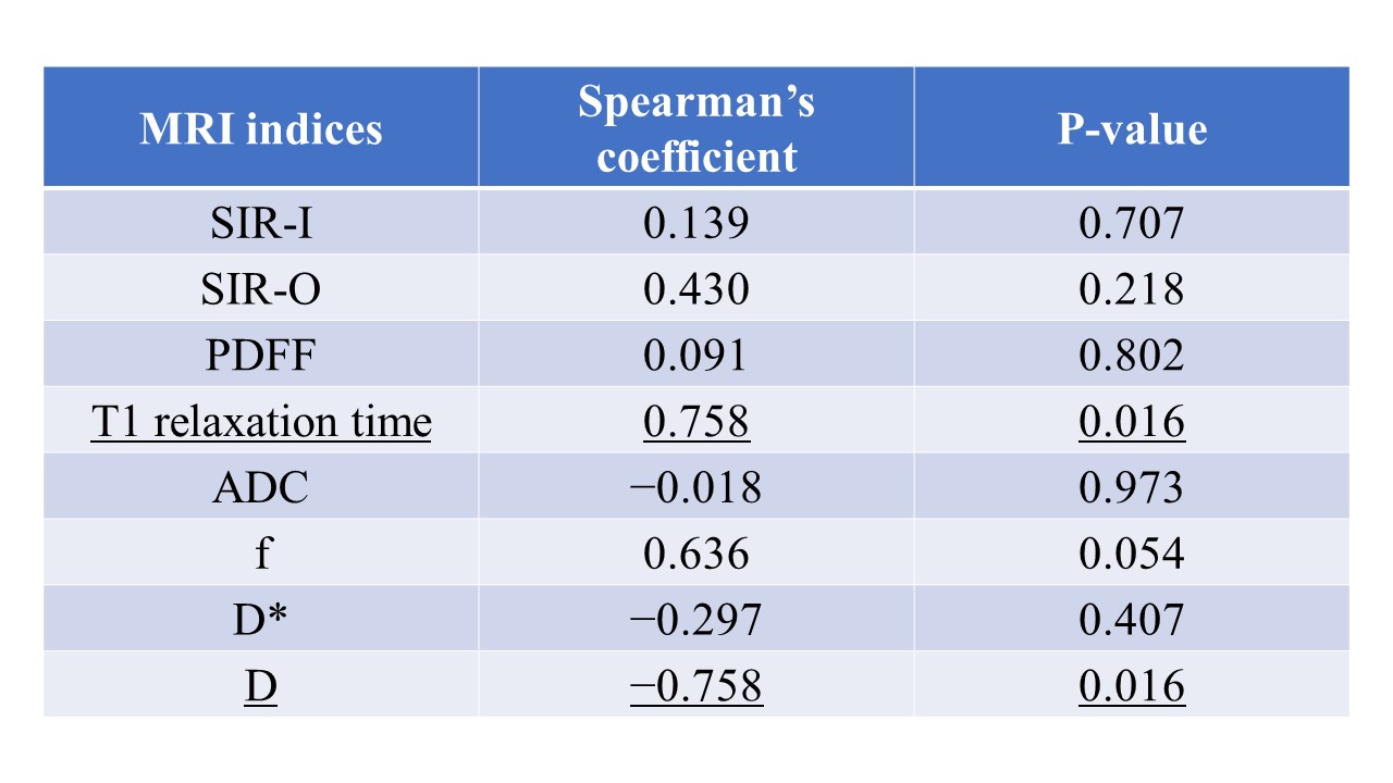 MRI indices were as follows: SIR-I, 1.16±0.18; SIR-O, 1.46±0.44; PDFF, 6.85±5.88;