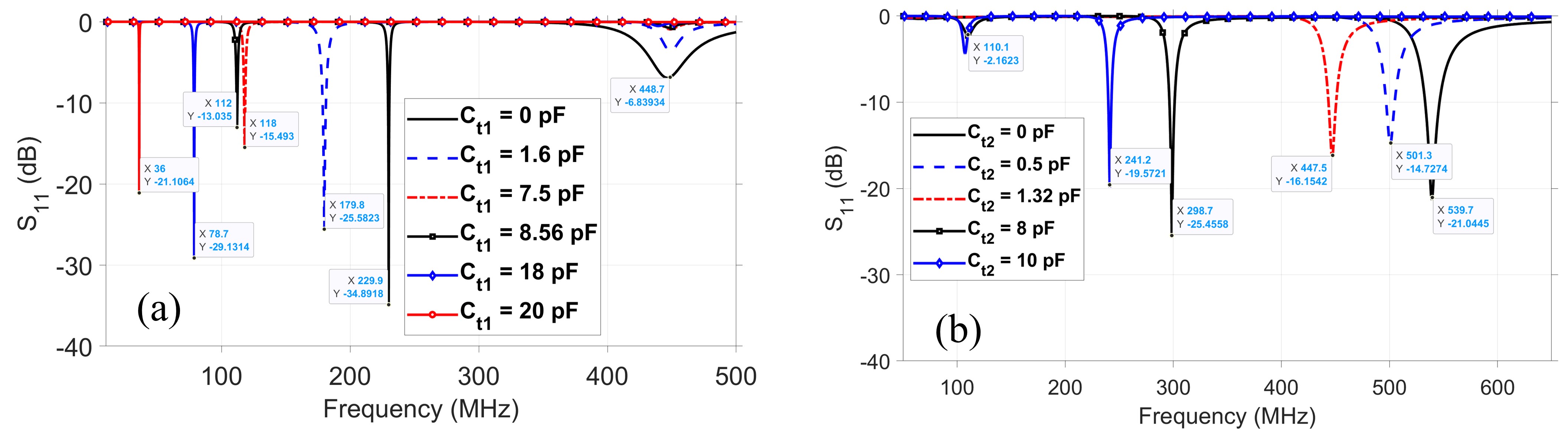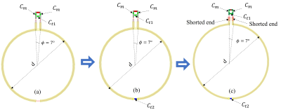 The evolution process of the proposed dual-band CTL with independent tuning capabilities is depicted in Fig. 1. The process starts with CTL2 introduced previously, where Cm is the matching capacitor and Ct1 is the tuning capacitor [see Fig. 1(a)]. In such design the tuning capacitor Ct1 control simultaneously the first (f1) and second (f2) resonant frequencies. In Fig. 2(b), another tuning capacitor Ct2 is added to the gap at the outer shield. Analysis has demonstrated that both resonant frequencies (f1 and f2) ) are also controlled by Ct2. By isolating the two arm of the outer shielding and shorting the inner conductor to the outer conductor, we obtained the design in Fig. 1 (c) namely “shorted end coaxial transmission line” (SECTL). Such design provides independent tuning capability such that the resonant frequency f1 is only dependent of Ct1 and f2 is only dependent of Ct2. The proposed SECTL design is used to implement a dual-tuned (1H/13C) designed at 10.5T where the Larmor frequencies of the proton 1H and the X-nucleus 13C operate at 447 MHz and 112 MHz, respectively. To validate the capability of the proposed dual band SECTL with independent control of each resonant frequency, we evaluated the scattering matrix of the design for a fixed value of Ct1 while varying Ct2 and vice versa. Furthermore, the transmit B1 field strength of the dual-band SECTL is also obtained at both frequencies. Results