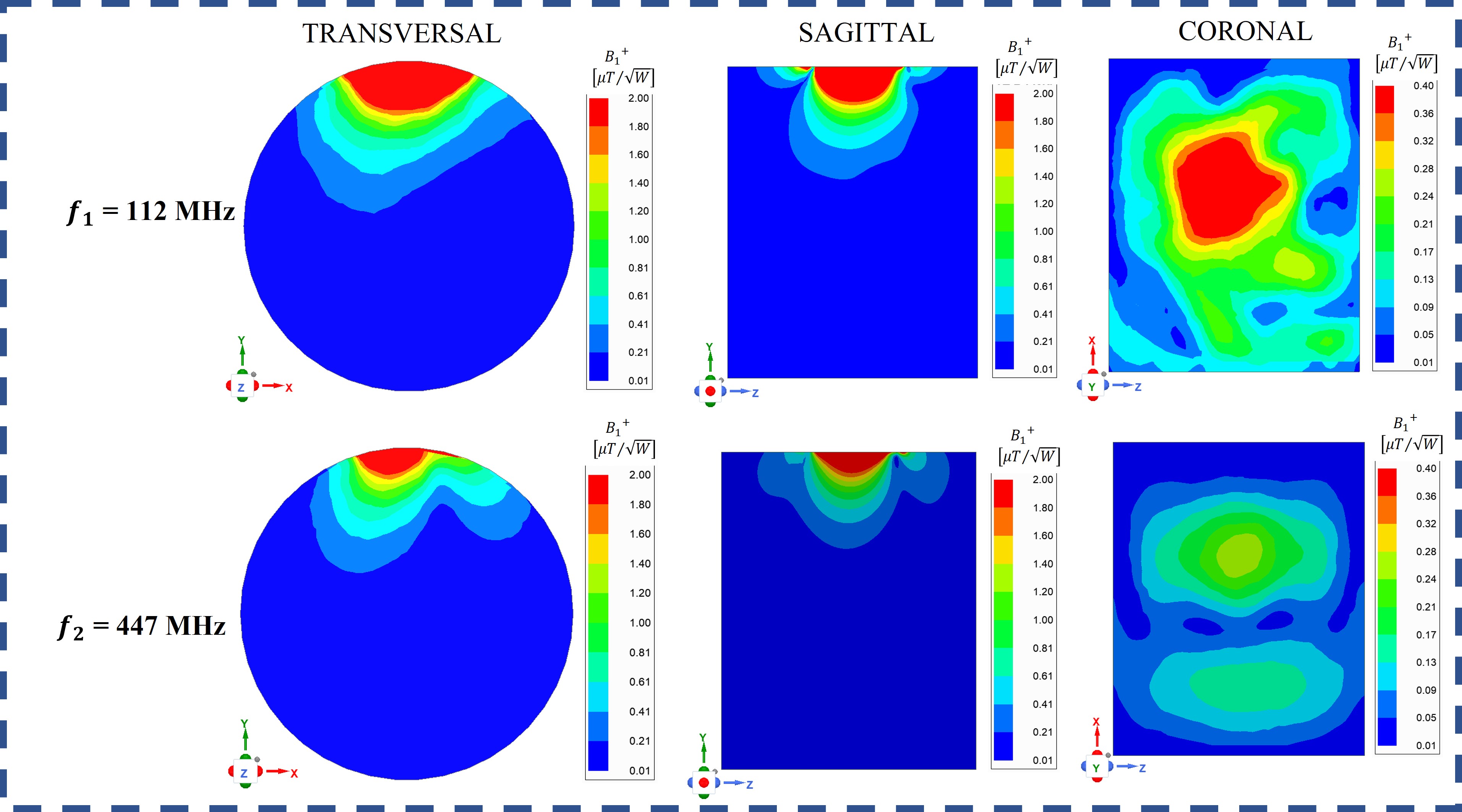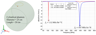 The proposed SECTL is placed 0.5 cm on top of a cylindrical phantom (with conductivity = 0.6 S/m and permittivity 50) to imitate human brain tissue (see Fig. 2). The parameters of the SECTL are the same as the “RG-405 .086" commercial coaxial cable. The diameter of the SECTL is set to 6 cm. A full wave simulation using High-Frequency Structure Simulator shows that the SECTL is designed for the dual-tuned (1H/13C) at 10.5T (Ct1 = 8.5 pF ; Ct2 = 1.3 pF ; Cm = 3.5 pF for 13C signal, and Cm = 150 pF for 1H signal). Note that a separate matching capacitor (Cm) is required for each band, meaning that a full duplex switch is required at the feeding point for practical use. A parametric study is performed on the SECTL. By simply adjusting the value of Ct1 while other parameters are fixed, simulations results shown that f1 can be tuned in a wide frequency range while f2 remains fixed [see Fig. 3 (a)]. On the other hand, Ct2 only control the tuning of f2 [see Fig. 3 (b)]. The simulated transmit field strength of the proposed SECTL designed for the for the dual-tuned (1H/13C) at 10.5T is illustrated in Fig. 4. The simulated (at both resonant frequencies) in all 2D planes cutting through the center of the phantom show similar field map compared to the one obtained from the conventional CTL 1,2,3.
