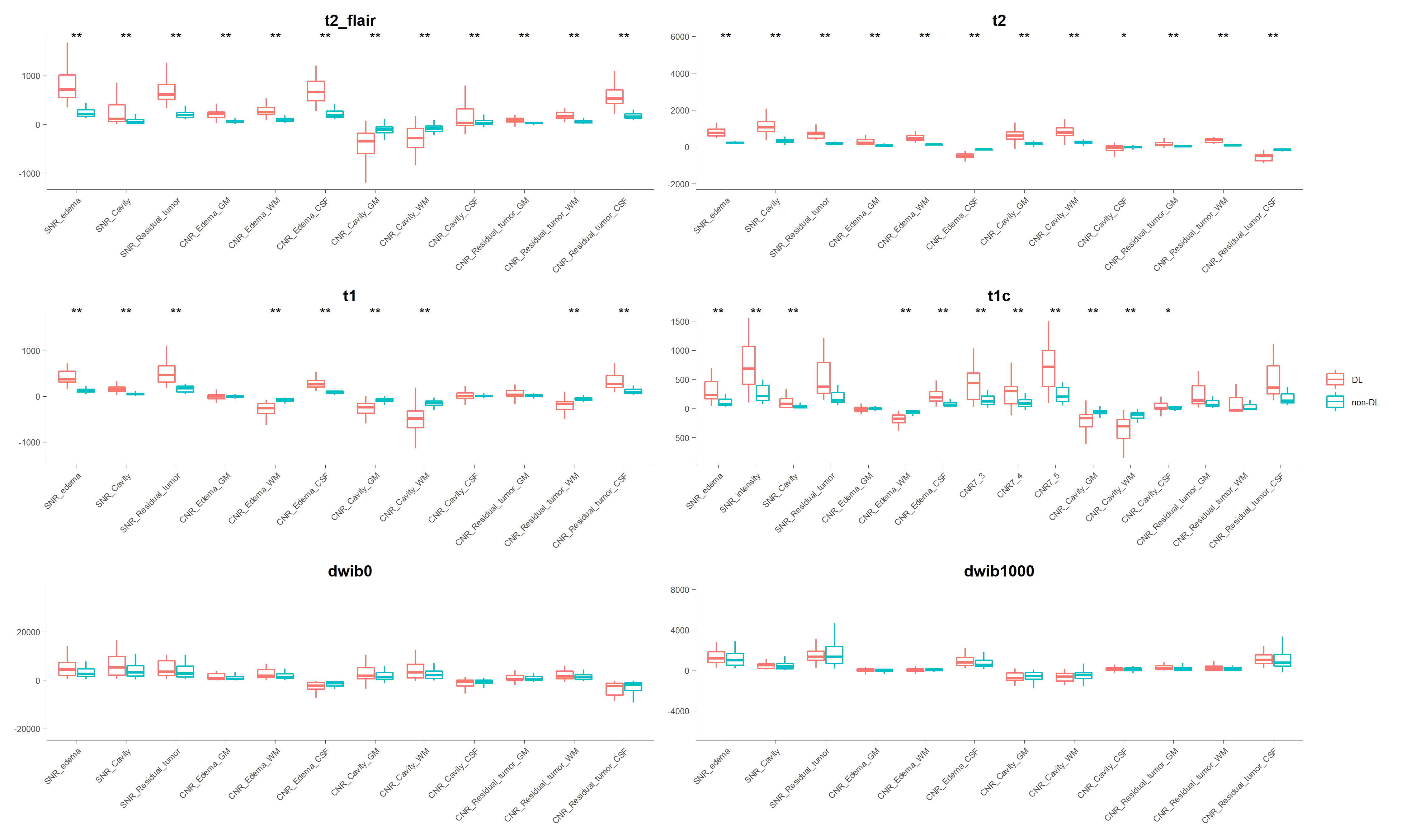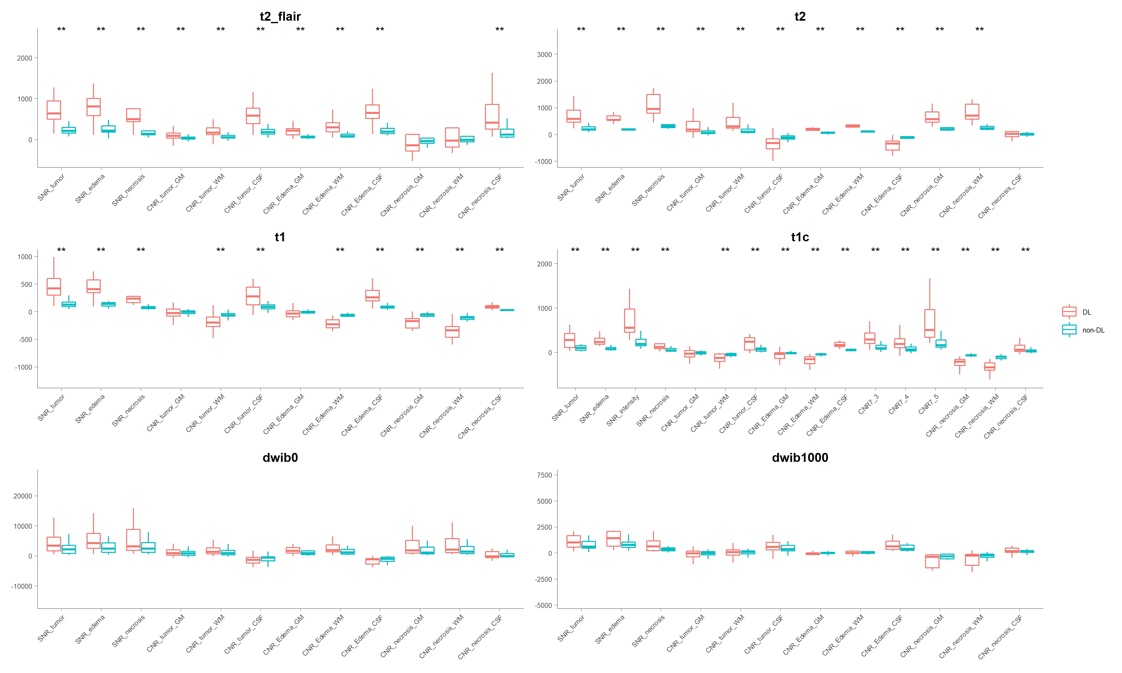 Figure 2 Mean SNR and CNR of multi-modal DL and conventionally reconstructed (non-DL) images in preoperative glioma cases