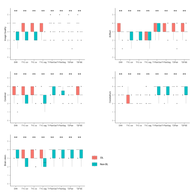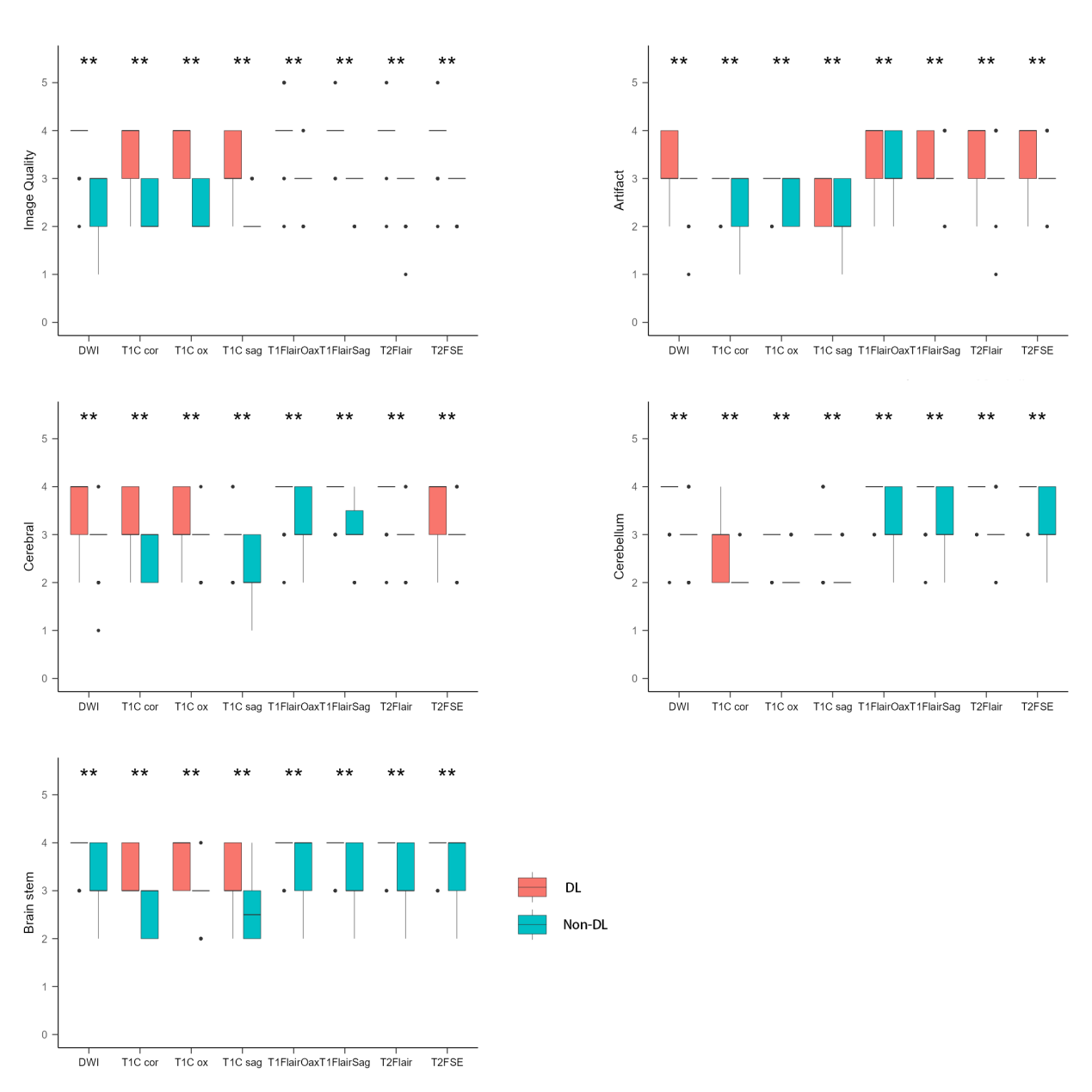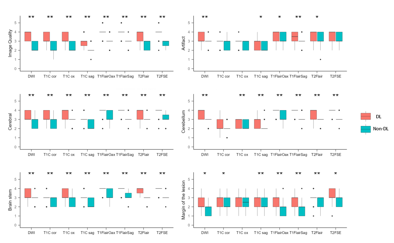 Figure 5 The visual assessment scores of DL and conventionally reconstructed (non-DL) images for postoperative cases
