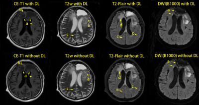 Deep learning reconstruction (DLR) approach with denoising can improve image quality of magnetic resonance (MR) images. However, its applications on multi-modal glioma imaging have not been assessed.Multi-modal images of 107 glioma patients were evaluated by signal-to-noise ratio (SNR), contrast-to-noise ratio (CNR), edge sharpness, visual assessment, diagnosis accuracy and efficiency. Contrasted with conventionally reconstructed images, the DLR images showed higher tumor/residual tumor SNR, higher tumor to white/gray matter CNR, better results of the visual assessment, and a trend of improved diagnosis efficiency and comparable accuracy. DLR can improve image quality of multi-modal glioma images which should benefit the glioma diagnosis.1. GBD 2016 Neurology Collaborators. Global, regional, and national burden of neurological disorders, 1990-2016: a systematic analysis for the Global Burden of Disease Study 2016. Lancet Neurol 2019;18(5):459-480.