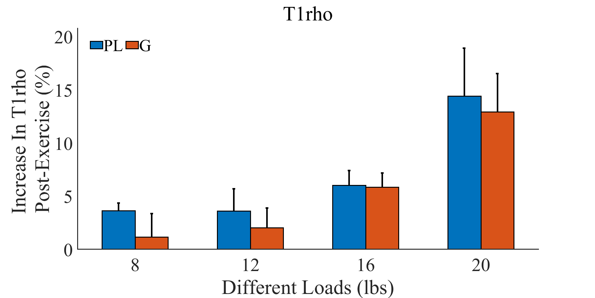 Figure 1 shows representative maps of T1ρ obtained after plantar flexion of various loads from one subject. Visual comparison of the maps reveals some increase of T1ρ in all the muscles, particularly PL for this subject. Table 1 summarizes the mean and STD of T1ρ values for PL and for G across all the plantar-flexion loads. There were trends of increase in T1ρ of both PL and G as exercise load increased particularly at the load of 20 lbs, but none of the changes was statistically significant. Figure 2 shows the post-exercise percentage increases of T1ρ as compared to their baseline levels. With plantar flexion of 20 lbs, PL and G’s T1ρ increased by 14.4%±4.5% and 12.9±3.6%, respectively. When combining the two muscles together for analysis, both the percentage increase at 20 lbs and at 16 lbs were significantly higher than that at 8 lbs (P value 0.016 and 0.028, respectively).Discussion
