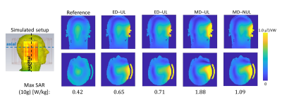 configurations based on long strips (‘ED-UL’ and ‘ED-NUL’) offer lower SAR,