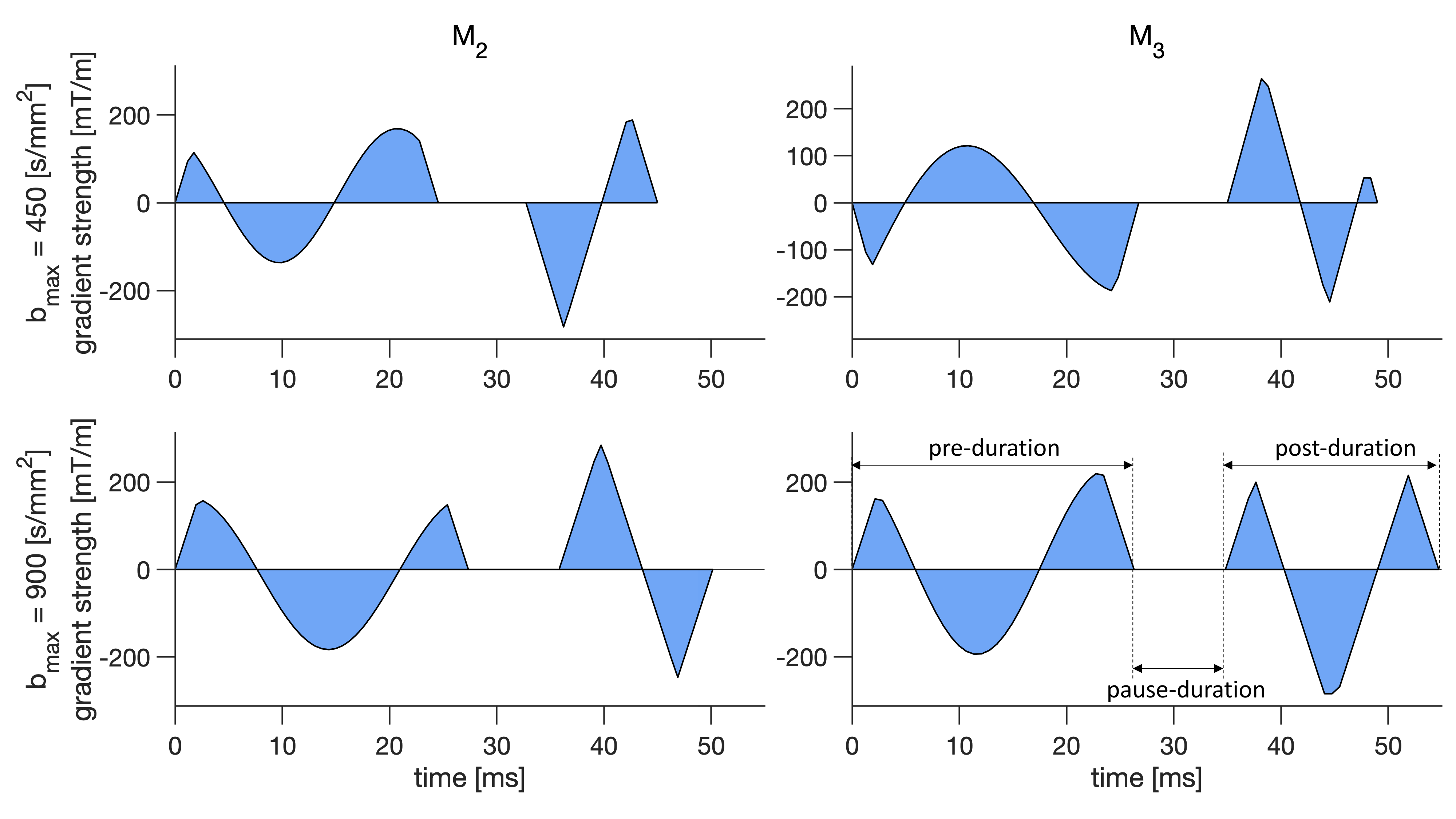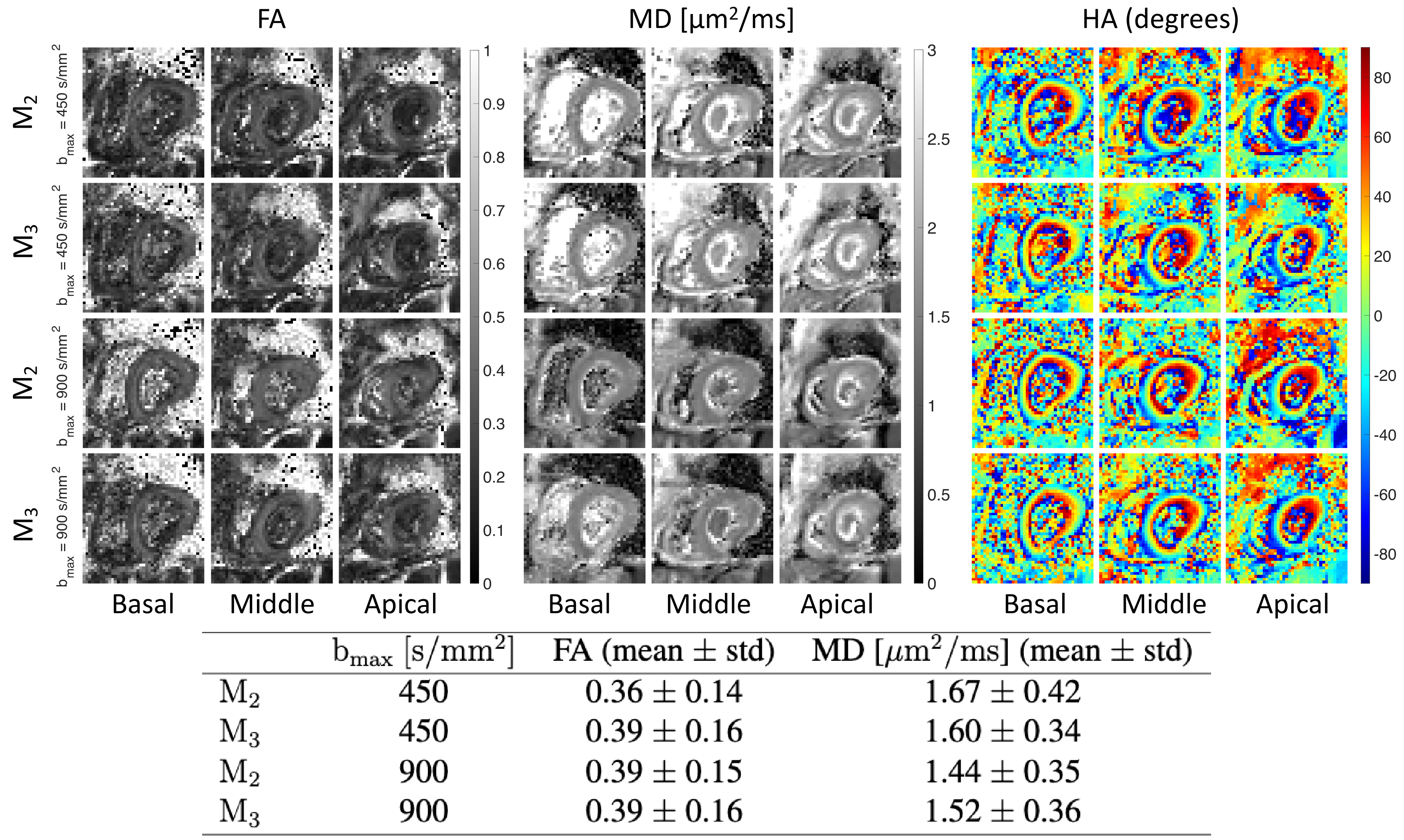 We used routine GRE and TRUEFISP sequences for cardiac planning and cine-imaging, whereas dMRI was performed with a prototype pulse sequence that enables diffusion encoding with user-defined gradient waveforms8. The imaging parameters were: TR = 3RR-intervals, field‐of‐view = 320 × 320 mm2, in‐plane resolution = 2.3 × 2.3 mm2, slice thickness = 8 mm, 3 short axis slices (base, mid, and apical), partial Fourier = 6/8, no parallel imaging, bandwidth = 2012 Hz/pixel. We used two bmax values, bmax = 450 s/mm2 which is commonly used in clinical scanners for cardiac diffusion MRI and twice this value which is bmax = 900 s/mm2 for both M2 and M3. The first diffusion-weighted imaging scheme includes b = 100 and 450 s/mm2 in 3 and 30 directions respectively with 6 repetitions while the second scheme includes b = 100, 450, and 900 s/mm2 in 10, 30, and 30 directions respectively with two repetitions. The total acquisition time was one hour. The details of the experiment design are given in Figure 2.Results