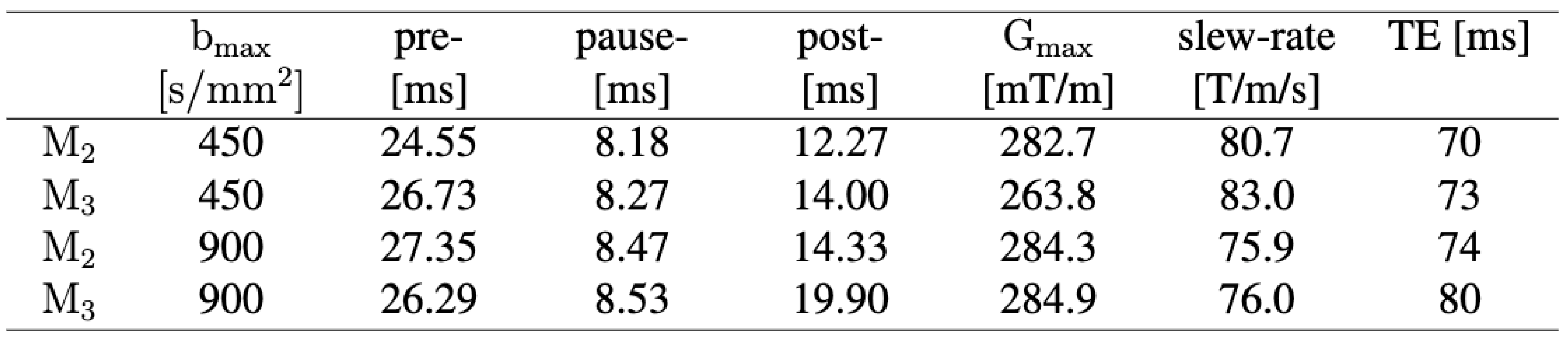 Second-order motion compensation is commonly used to compensate the acceleration and velocity. Third-order compensation needs a long echo time (TE), however using a Connectom scanner, the minimum TE for bmax = 450 s/mm2 is 73 ms which is of the order of the echo time that is used in clinical scanners for second-order motion compensated waveforms9,10. Note that we do not have the Zoom-IT pulse available on the Connectom and so we need to acquire a larger FoV which makes the echo time longer.