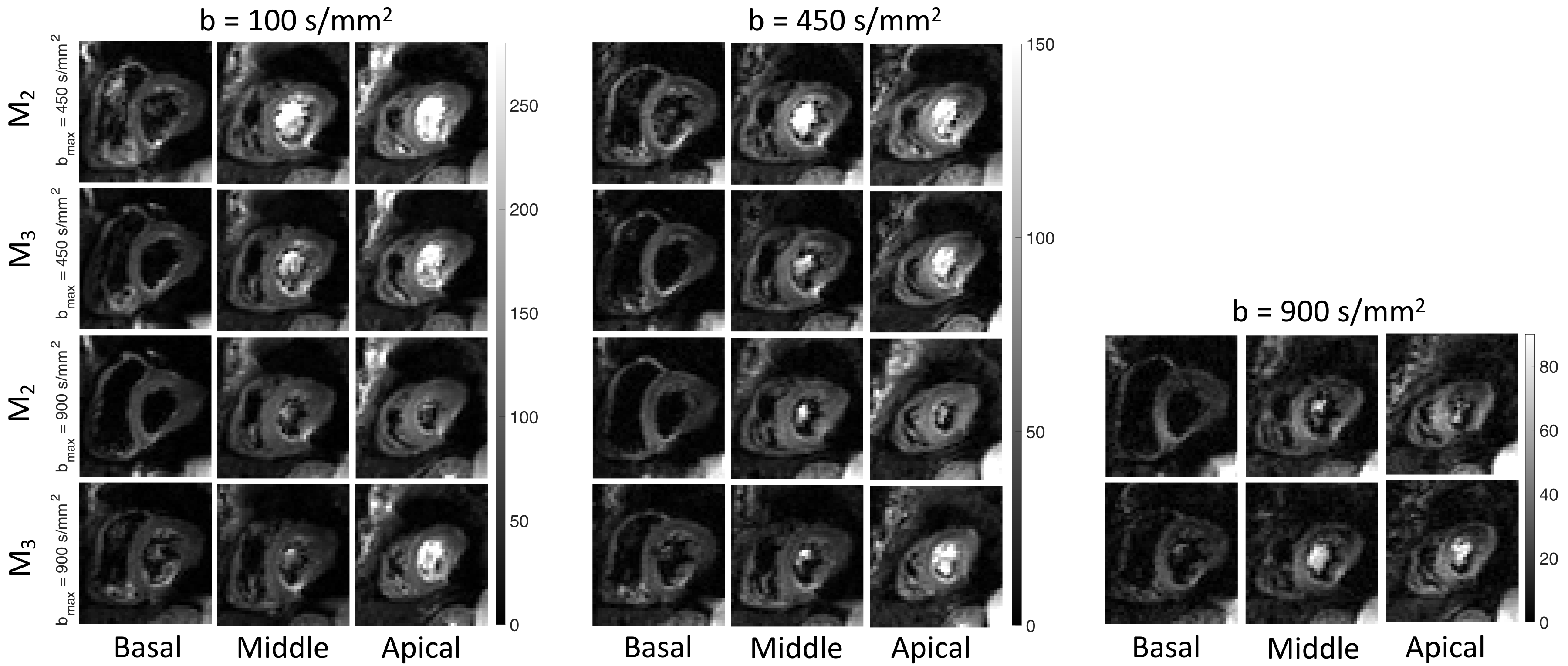 Figure 3 shows the cardiac diffusion-weighted images acquired in basal, mid, and apical slices with b = 100, 450, and 900 s/mm2 using four different acquisition schemes.