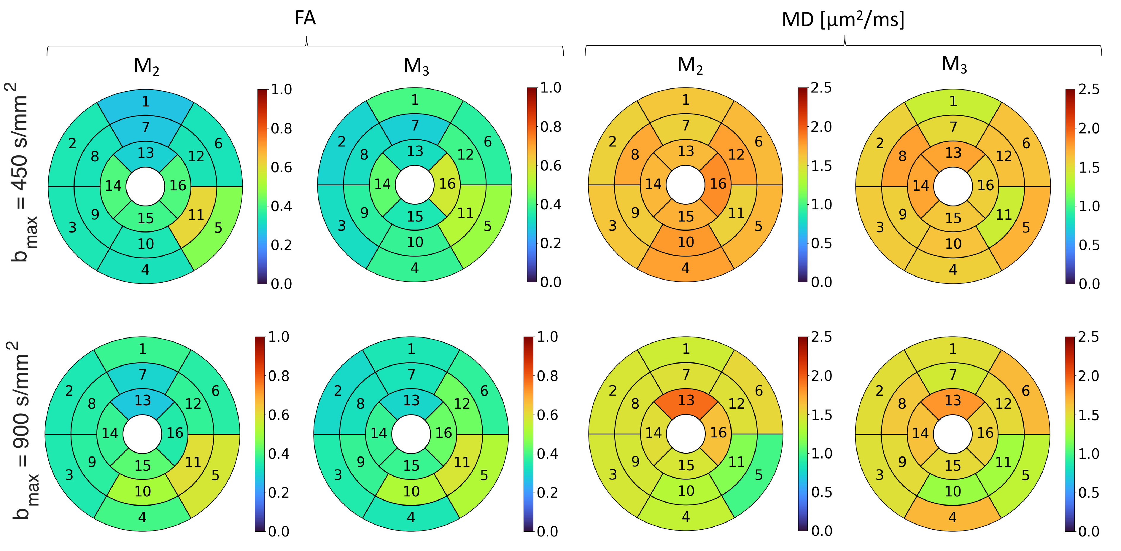 Figure 5 shows the bullseye plots for FA and MD corresponding to each segment of the American heart association (AHA) model using second and third-order motion compensated waveform (M2 and M3) with bmax = 450 s/mm2 and bmax = 900 s/mm2. The values are consistent between different acquisitions and we do not observe any significant difference between the plots visually. It shows the feasibility of acquiring cardiac dMRI data with reasonable quality using the Connectom scanner. Discussion