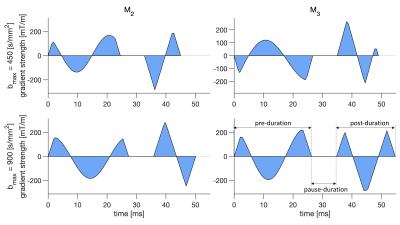 We acquired cardiac dMRI on a Connectom 3T research-only MR imaging system (Siemens Healthcare, Erlangen, Germany) with a gradient strength of 300 mT/m and a slew rate of 200 T/m/s. Data were acquired from five healthy volunteers who provided written consent. Optimizing gradient performance with respect to maximum amplitude and slew rate needs to consider PNS5,6. Therefore, we carefully designed up to order 3 (M2 and M3) motion-compensated gradient waveforms with a maximum gradient strength of 285 mT/m and a maximum slew rate of 80 T/m/s using the NOW toolbox7 (Figure 1).