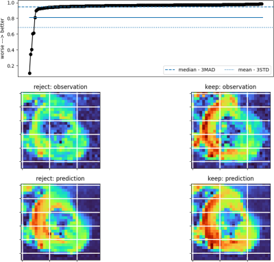 Cardiac Diffusion Tensor Imaging (cDTI) is prone to imaging artefacts including distortion, signal dropout, and misregistration even after post-processing. We developed a method for image rejection based on a comparison between the observed images and the corresponding set of predicted images generated by tensor models fit to the observed data. A rejection threshold to exclude images from subsequent refitting of the tensor model can be chosen by the user with a simple graphical method.1. Niethammer, M., Bouix, S., Aja-Fernández, S., Westin, C.-F., & Shenton, M. E. (2007). Outlier Rejection for Diffusion Weighted Imaging. In N. Ayache, S. Ourselin, & A. Maeder (Eds.), Medical Image Computing and Computer-Assisted Intervention – MICCAI 2007 (pp. 161–168). Springer.