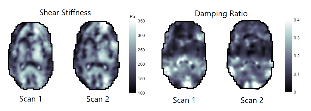 In conclusion, 7T MRI measurements of cardiac-induced brain tissue deformation consistently allow for non-invasive estimation of brain stiffness, with good test-retest repeatability. Stiffness parameter distributions of the brain were reconstructed where the grey and white matter exhibit similar values. This method may be valuable for studying the effects of brain disease on tissue microstructure. Further optimization of the NLI reconstruction is still necessary, including testing a poroelastic model.Acknowledgements