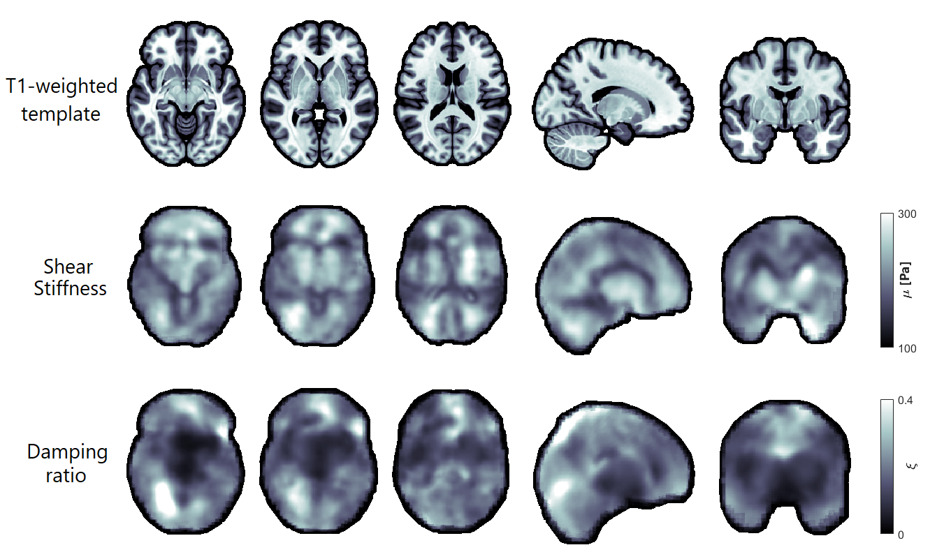 We used data from a previously described 7T MRI study, which used Displacement Encoding with Stimulated Echoes (DENSE)4. The data consisted of 3D displacement measurements (1.95x1.95x2.2 mm resolution), time-resolved over the cardiac cycle (20 cardiac phases), for eight subjects, including a repeated scan after repositioning of the subject. Stiffness parameters were then reconstructed at the first harmonic frequency (approximately 1 Hz) by applying a 3D subzone-based non-linear inversion (NLI) scheme5. A viscoelastic model of the brain was used, yielding the complex parameters shear modulus $$$G^*=G'+G'$$$' with $$$G'$$$ being the storage modulus and $$$G''$$$ the loss modulus, and damping ratio $$$\xi$$$ as stiffness parameters of interest. In this model for low frequencies, only relative distributions of the stiffness parameters can be recovered as the inertial forces produced by cardiac pulse are negligible compared to the elastic forces of the brain6. This results in the reconstructed parameters having non-unique solutions. Finally, the shear stiffness $$$\mu$$$ can be calculated from the storage and loss modulus as $$\mu = \frac{2|G^*|^2}{G'+|G^*|}$$ and the damping ratio as $$$\xi=G''/2G'$$$.Results