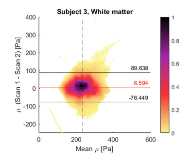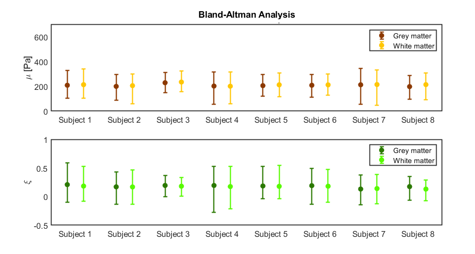 Figure 1 shows representative axial slices for each stiffness parameter along with repeat scans that have been registered to the original scans. Figure 2 shows the mean over all subjects and repeats for each stiffness parameter, where the distributions have been registered to the MNI-ICBM2009c brain atlas7. Table 1 shows the mean and standard deviation for each stiffness parameter, separated for the grey and white matter and the repeat scans. A paired t-test shows that the gray and white matter distributions are not significantly different for any stiffness parameter. Figure 3 shows an example plot of a Bland-Altman analysis for one subject. Figure 4 shows a summarized repeatability analysis for each subject and stiffness parameter, separated for the grey and white matter. Each error bar represents a summarized Bland-Altman plot where the dot represents the mean of the two scans and the whiskers represent the limits of agreements.Discussion