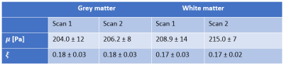 The mean distributions in Figure 1 shows a lot of structural features of the brain. In particular, the shear stiffness shows good agreement with the T1-weighted templates in each of the shown slices. This is also reflected in Figure 2, where again many features of the brain can be seen. Additionally, the repeat scans show very good agreement with the original scans, adding confidence to the repeatability. In some places along the periphery of the brain, bright areas of large values can be seen. Such “hotspots” are likely artifacts that arise due to the large quantity of cerebrospinal fluid (CSF) that exists along the boundary of the brain which moves significantly faster than the surrounding tissue, giving artifact-like values during the acquisition. Work is ongoing to mask such voxels but is not yet implemented for these results. The stiffness parameter distributions show very similar values in both scans for all parameters, as shown in Table 1. The grey and white matter also exhibit similar stiffness parameter, with white matter being only slightly stiffer on average. This is again reflected in Figure 3, where the same pattern is observed in all subjects. The comparative length of the two whiskers in an error bar captures the difference between the two scans. Some slight bias can be seen in some measurements, although this is likely predominantly an effect of the previously described hotspots as they appear sporadically between repeat scans. The non-uniqueness of the viscoelastic solution at low frequencies renders only comparative values of interest in this analysis. Future work aims to perform a regional analysis, as well as to integrate a poroelastic brain model in the NLI reconstruction scheme, which is shown to produce unique solutions even at low frequencies6.Conclusion