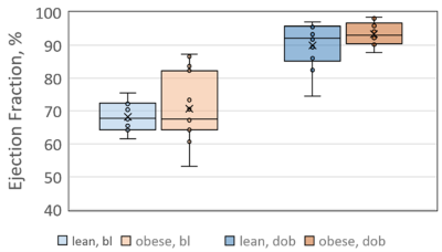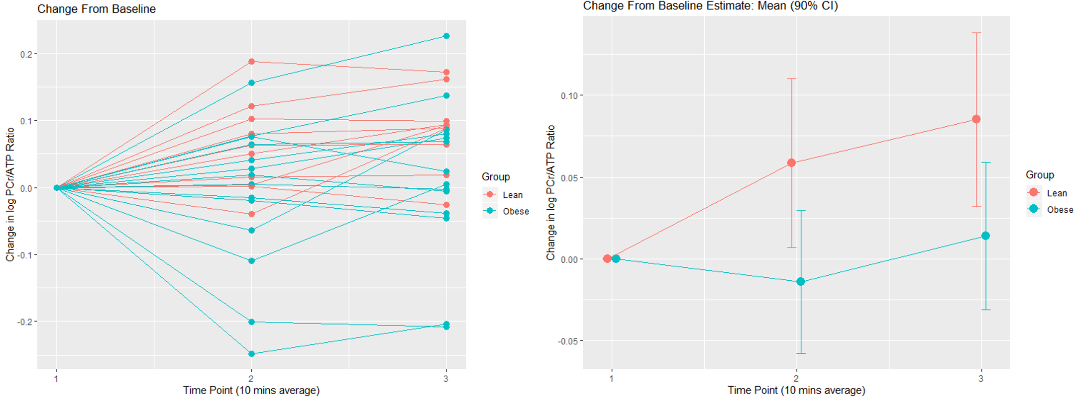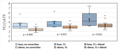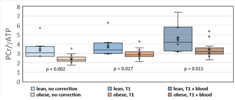 As expected, LVEF increased following dobutamine in both lean and obese animals. Groups were not significantly different from each other at baseline or after dobutamine challenge (figure 1). A representative one-minute cardiac 31P spectrum from the serial acquisition is shown in figure 2, along with the model fit from the Bayesian Analysis Toolbox. In the baseline condition, obese animals (n=14) had a significantly lower PCr/γATP ratio than lean animals (n=10) using uncorrected spectra (p = 0.002), T1-corrected spectra (p = 0.017), and T1- and blood-corrected spectra (p = 0.011) (figure 3). Group level differences in PCr/γATP change-from-baseline only reached significance in spectra corrected for both saturation and blood contamination (p=0.040 and p=0.047 for 0-10 minutes and 10-20 minutes post dobutamine, respectively) (figure4). All statistics were performed on log-transformed results to normalize the distributions and reduce sensitivity to outliers. Spectra from one obese animal was discarded due to exceptionally broad linewidths and poor spectral modeling. Discussion