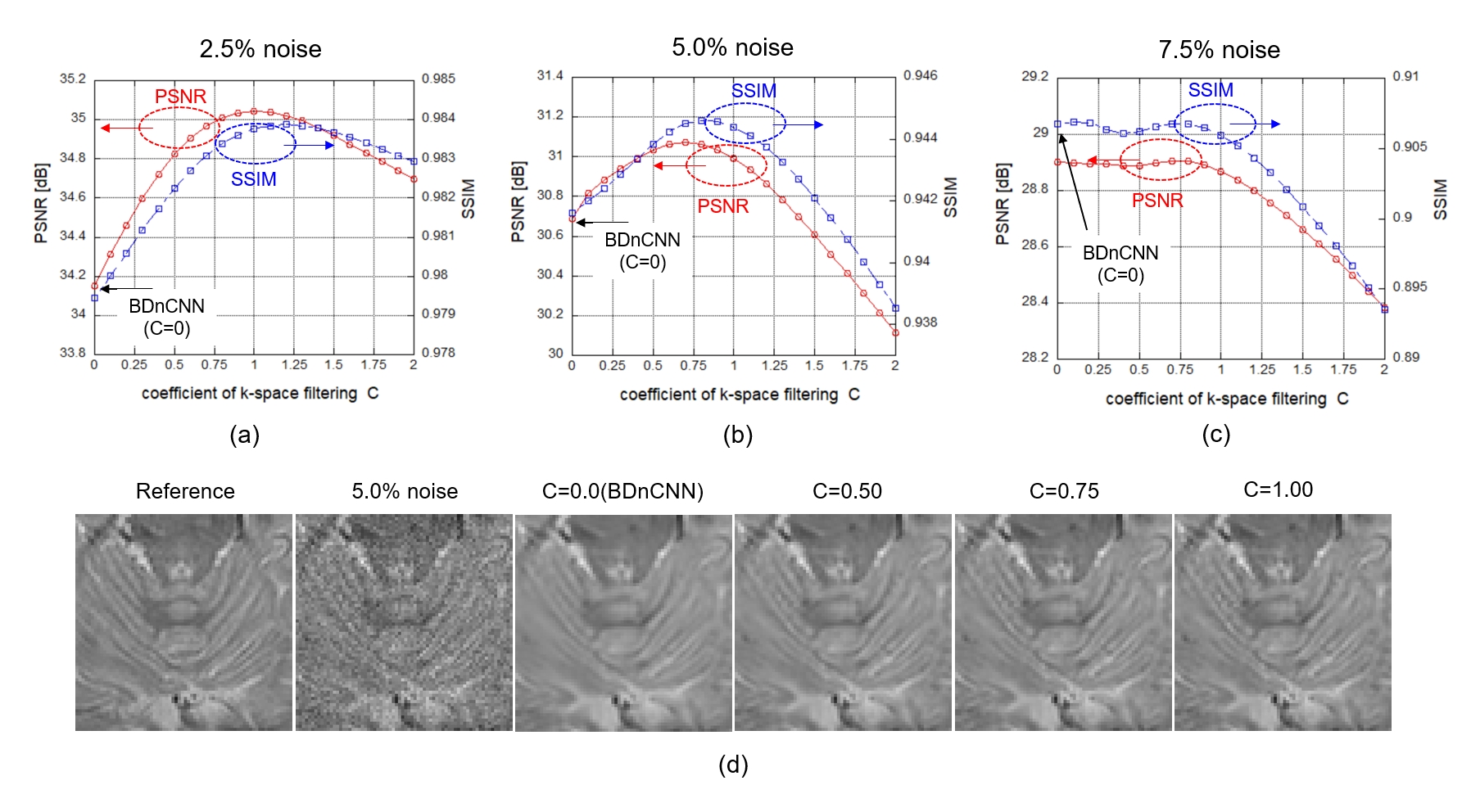 combined in a single batch. Figure 2 (a)-(c) show the PSNR and SSIM of denoised
