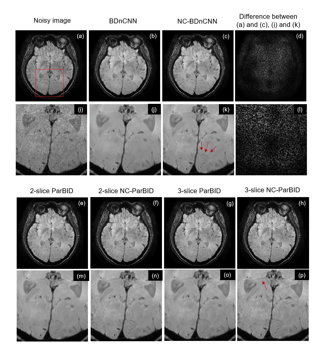 NC-BDnCNN as pointed by red arrows shown in (c) and (k). The application of