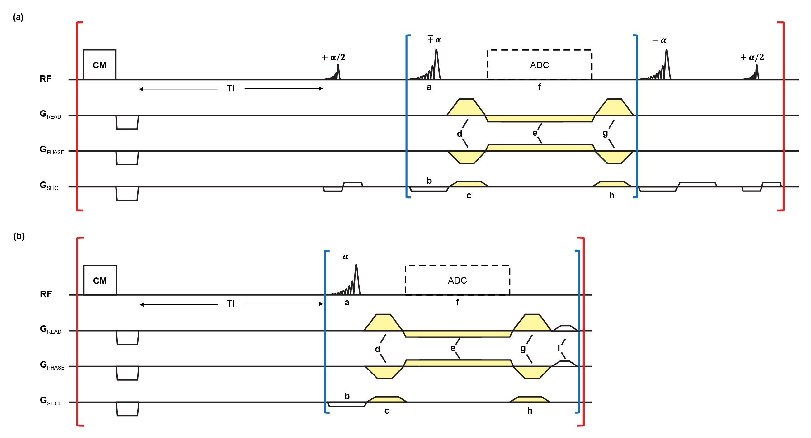 For the unbalanced T1RESS (uT1RESS) version (Figure 1b), the CM pulse is generated before the dummy pulses for the next angle (without α/2 preparation and flip-back pulses). After rewinding frequency-encoding and phase-encoding gradients at the end of each TR, a weak gradient spoiler (Figure 1b.i) is applied in constant frequency-encoding direction throughout the entire acquisition, which creates a controllable amount of flow-induced dephasing.