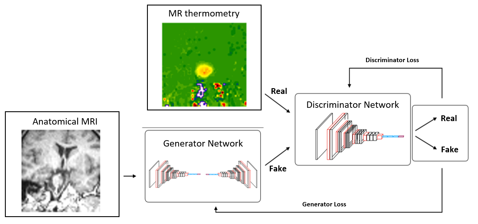 Artificial intelligence algorithms are used to model the nonlinear mapping from anatomical MRI planning images to MR thermometry images. An existing dataset of epilepsy patients’ undergoing MRgLITT surgery, was used in this study. The dataset consists of each patient’s 3D anatomical T1-weighted MRI and the MR thermometry images, acquired over three parallel image slices during the surgery (Figure 1). The noisy pixels are detected due to the low signal-to-noise ratio in thermometry calculation in some parts of the brain like bones. A conditional generative adversarial network (cGAN)7 model was trained as an AI model (Figure 2). All anatomical MRI and MR thermometry images are cropped by the center of the treatment area to avoid non-useful, computationally expensive information. In this study one slice of anatomical MRI (2D) is used that corresponded to the center slice of MR thermometry (2D). Two image domains for each patient are aligned to keep the spatially related information. A dataset of 234 patients are used to train the cGAN and 53 patient sets are used to test the network. The evaluation metric to compare the network-generated thermometry image and the real thermometry image (came from previous MRgLITT surgeries) is the sum of squared differences (SSD). Results
