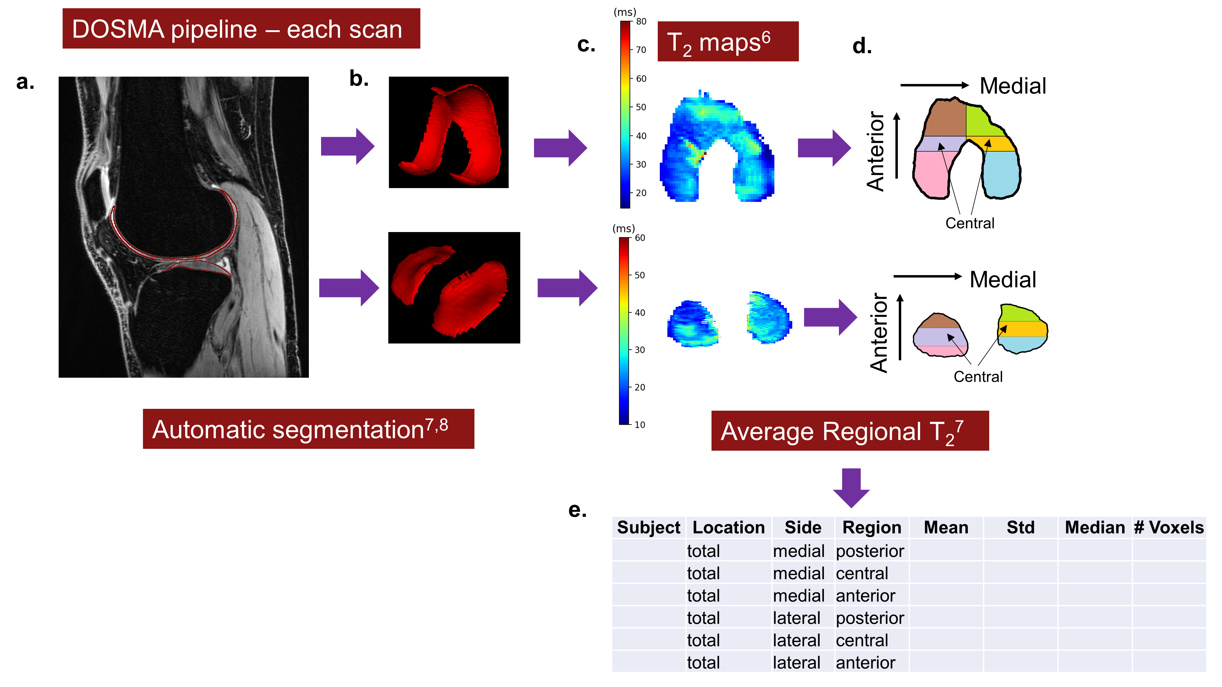 At each scanner, subjects were scanned twice. Between scans, the subjects were removed from the scanner and repositioned. Cartilage segmentation was performed using a publicly available deep-learning model provided by DOSMA, an open-source Python framework for musculoskeletal analysis7,8. All segmentations were manually checked, and no corrections were made. Voxelwise cartilage T2 values were determined using a previously validated method based on extended phase graph modeling6. Mean T2 was calculated across the full thickness of the cartilage of six tibial and femoral regions (anterior, central, and posterior regions of the medial and lateral compartments9,10) (Figure 1).
