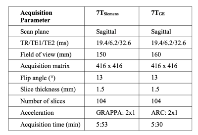 Five healthy adults (3 males, age range: 20-50 years) without history of lower limb joint trauma were enrolled in this Institutional Review Board-approved study with appropriate informed consent in place. Their right knees were imaged using the following whole-body 7T scanners: a GE950 7T (GE Healthcare, Waukesha, WI, USA) and a 7T MAGNETOM Terra (Siemens Healthineers, Erlangen, Germany). Both scanners used a 28 Channel Transmit/Receive Knee Coil (Quality Electrodynamics, Cleveland, OH USA). qDESS images were acquired to calculate the knee cartilage T2 relaxation times6; sequence parameters and subject scanning conditions were standardized across vendors where possible (Table 1).