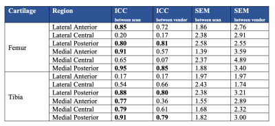 T2 relaxation showed better repeatability between scans than between vendors taken from different vendors (Table 2). T2 relaxation times between scans had excellent repeatability (ICCs ≥ 0.75) in most regions (Table 2). Cross-vendors, the medial and lateral posterior cartilage of the tibia and femur had good to excellent repeatability (ICCs ≥ 0.75). The SEMs between repeated scans were relatively small at 1.4 to 2.6ms, yielding minimum detectable change values ranging from ~3-5ms. SEMs between vendors were larger, and thus required between 4-11ms of change to be detectableDiscussion