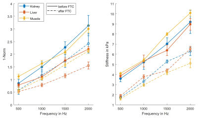 Group values of kidney, liver and muscle over frequency before and after the FTC are illustrated in figure 1, and a representative case of kidney tissue is shown in figure 2. A significant decrease was found for all tissues and frequencies for both 1-Norm and stiffness after the FTC (P<0.05), except for kidney tissue at 500 Hz (P=0.052) and frequency-averaged values (P=0.11) where a non-significant trend for decrease was found. Group and frequency-averaged values showed an FTC-related decreased of both 1-Norm and stiffness as follows: kidney by -23.7% and -33.6% (1.94±0.85 vs. 1.48±0.68, p=0.110; and 6.25±2.09 kPa vs. 4.15±1.76 kPa, p=0.003), liver by -31.5% and -32.5% (1.46±0.55 vs. 1.00±0.39, P=0.006; and 6.13±1.86 kPa vs. 4.14±1.66 kPa, P=0.003), and muscle by -32.1% and -49.9% (1.96±0.69 vs. 1.33±0.59, P=0.007; and 6.89±2.30 kPa and 3.45±1.31 kPa, P<0.001).Discussion