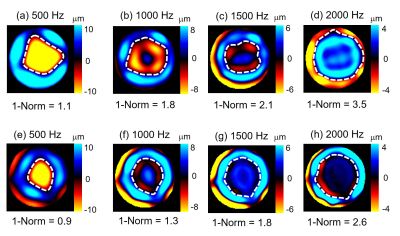 In this explorative study, we prospectively examined fresh ex vivo porcine kidney (n=6), liver (n=6) and muscle (n=6) before and after the FTC at 500, 1000, 1500 and 2000 Hz with 0.5T tabletop MRE (Pure Devices, Würzburg, Germany) as described in 4,5. Samples were scanned before the FTC and then frozen at -20˚C for 24 hours, fully thawed to room temperature (23˚C, approx. 2 h), and the same set of MRE experiments was repeated. Scan parameters were: field of view, 10mm×10mm; matrix, 128×128; number of slices, 1; slice thickness, 5 mm; TE, 35.8ms; TR, 500ms; number of averages, 1; number of time steps, 4; pulse sequence, spin echo. 1-Norm as a representation of the degree of inhomogeneity was compared with the conventional wave inversion, where stiffness was represented by the real part of the complex shear modulus. 1-Norm data processing is described in detail in 1. Of note, this study is complementary to previously published data on the rheological modeling of porcine kidney, liver and muscle tissue.3 The reason for this complementary analysis was that the previously used methods were constrained in assessing mechanical inhomogeneity. Results
