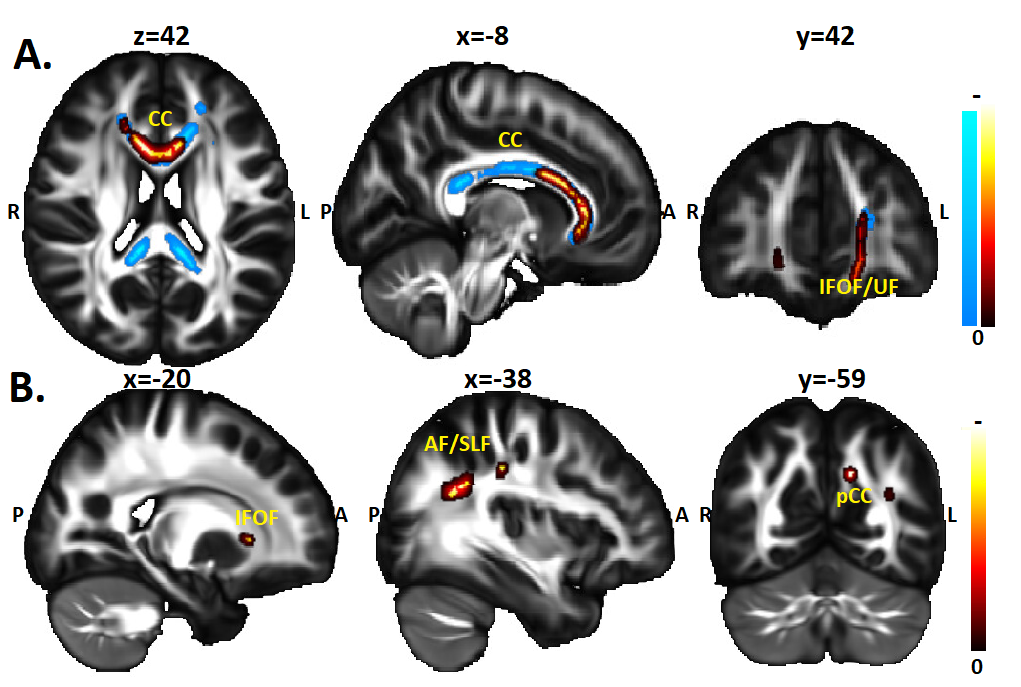 ACE, measured by CTQ sum score was negatively correlated with fractional anisotropy (FA) in the genu and body of the corpus callosum (CC) and the bilateral uncinated fasciculus (UF)/inferior frontal occipital fasciculus (IFOF) pathway after controlling for overall psychological burden (Figure. 2 A, red color bar). Also, persons with ACE and PTSD showed reduced FA in whole CC, left UF, compared to person with ACE and no PTSD (Figure. 2 A, blue color bar). ACE subtypes (i.e. abuse & neglect) showed no significant relationship with WM integrity. In our subgroup sample study, PTSD group had lower FA in the Left Superior Longitudinal Fasciculus (SLF), Left IFOF, and Left posterior CC compared to non PTSD group (Figure. 2 B). MD and L1 showed no significant results in all analyses. Discussion & Conclusion: