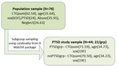 A total of 78 participants with any form of ACE were included in this study. 24 of the 78 participants were diagnosed with PTSD at the time of the study. Participants completed the childhood trauma questionnaire (CTQ) and a structured clinical interview for DSM-5 (SCID-II) to ascertain PTSD diagnosis. Variables of interest such as CTQ sum score (62.54±19.94), CTQ abuse score (35.91±13.17) and CTQ neglect score (26.63±8.59), age (31.64±10.79yrs) and sex (65F), were computed after. Diffusion MRI scans (82 volumes, 3 at b=0 and 79 at b=1000 s/mm2) were then acquired to assess the WM integrity. Diffusion data were then denoised and subsequent corrections for bias field, eddy currents, and motion were performed. FA, MD and L1 maps for all subjects were created with fslfit and TBSS analyses was performed. Voxel-wise statistical analysis of individual skeleton maps were performed using multiple regression models and a paired t-test model (for the PTSD subgroup sample study) and corrected for multiple correction error at p=0.05 using FSL’s randomise. Age, sex and overall psychosocial burden (measured by the Brief Symptom Inventory (BSI)) were controlled for in all analyses. Subgroup sampling was performed using cardinality from R MatchIt(5) package with gurobi optimiser (Figure 1).Results: