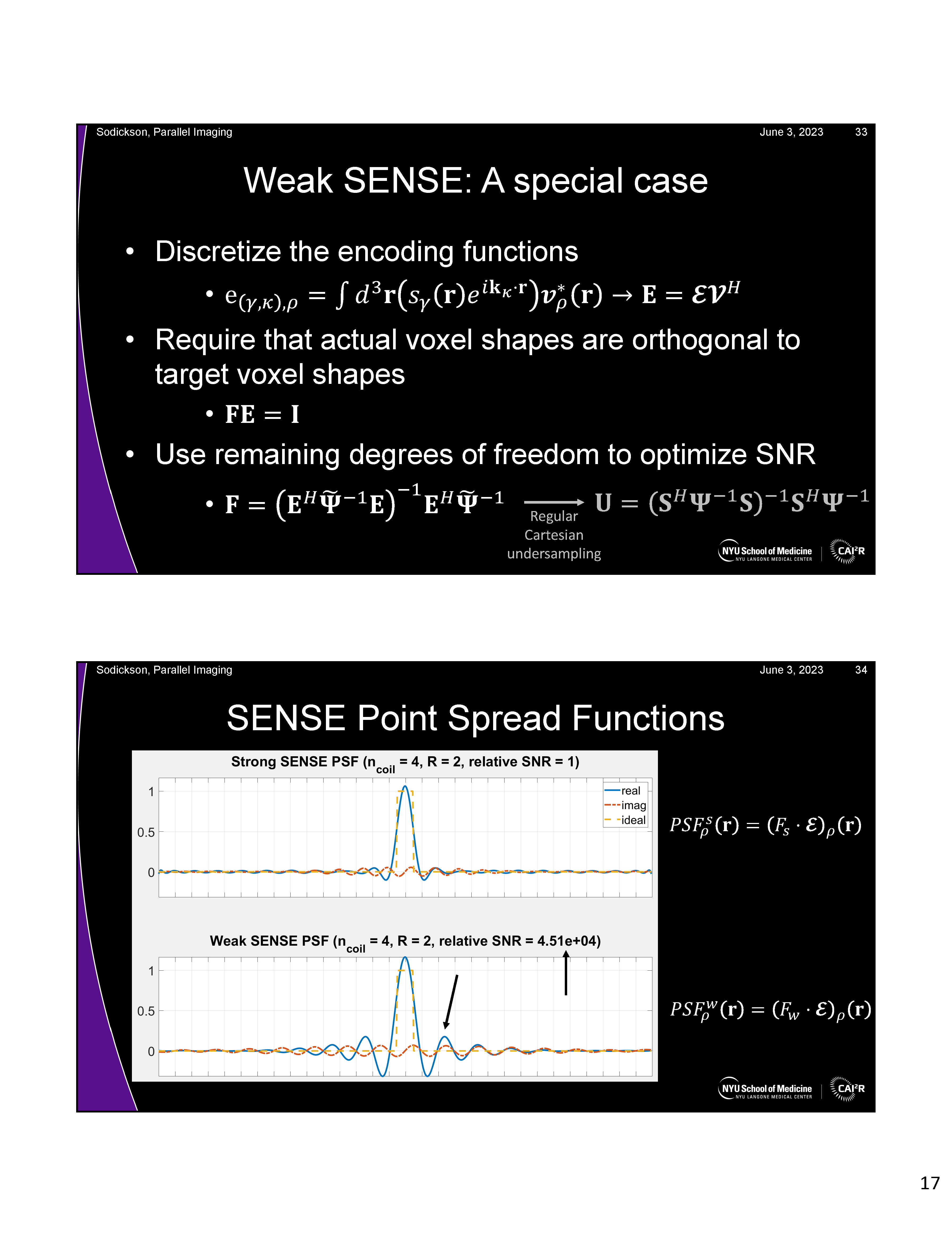 This talk will review the use of radiofrequency (RF) coils for spatial encoding in MRI. RF coils have spatially varying sensitivities to MR signal. As a result, combining information from multiple coils allows spatial discrimination of regions not explicitly separated by magnetic field gradients; or, alternatively, it allows missing data not explicitly encoded with gradients to be filled in. The talk will introduce SMASH, SENSE and GRAPPA parallel imaging approaches as distinct but related fitting problems. It will then place parallel imaging in the broader context of inverse problems to be introduced in subsequent lectures.
