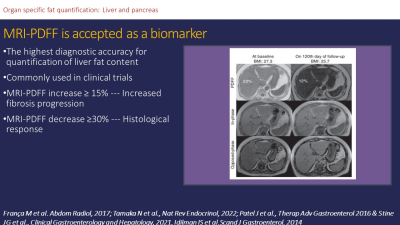 Hepatic steatosis is the abnormal accumulation of triglycerides in the hepatocytes whereas a fatty pancreas is the abnormal pancreatic fat accumulation. Both are shown to be associated with metabolic syndrome, Type 2 diabetes, and cardiovascular diseases. The main approach to quantifying liver and pancreas fat is chemical shift magnetic resonance imaging (MRI) techniques. MRI-proton density fat fraction (MRI-PDFF) is shown to be an excellent diagnostic value for the assessment of hepatic fat content and classification of histologic steatosis grades in non-alcoholic fatty liver disease.